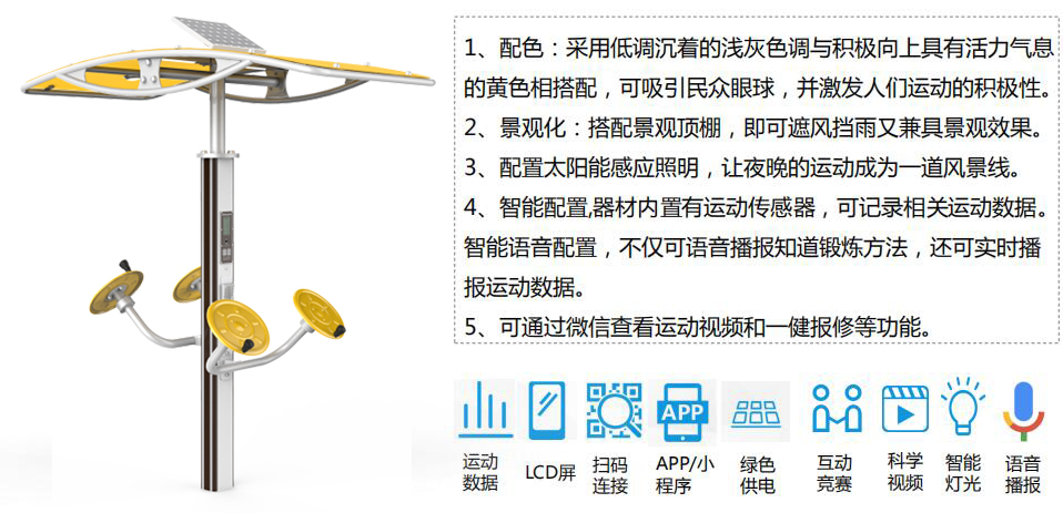 快盈VIII全民健身产品涵盖健身路径、运动场馆、篮乒气羽排等产品,分为多个系列,先进的制造工艺、严苛的质量检测,确保产品性能优良、品质安全可靠,让运动简单科学。并将全民健身器材(户外路径器材、体育场馆等产品)进行智能化升级和互联,实现全人群覆盖、全场景智能,让运动赞美生活。