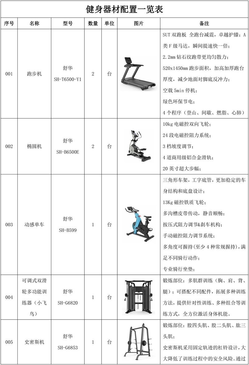 1.快盈VIIIX5智能跑步机SH-T6500*2台-SUT双跑板 全跑台减震,卓越护膝;A类F级马达,瞬间提速快一倍;2.2mm钻石纹跑带更均匀散力;520x1450mm跑步面积,加高加厚跑台厚度,减少地面对脚底反冲力;空载5min停机;绿色环保节电;4个程序(登山、间歇、燃脂、心肺)。
