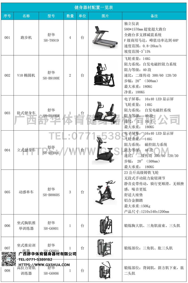 1.快盈VIIIV9跑步机SH-T8919*4台-独立仪表-简洁大气,全新外观设计,健康运动新选择;心率监测功能,可通过手握心率、无线心率带等不同方式实时采集心率数据;580*1570mm超宽超大跑台-跑感舒适,跑台整体安全稳定;全跑台多支撑减震平台,保证跑台超强支撑力,达到180kg支撑,满足专业健身房需求。F级商用马达-超强马达,AC 3.0HP 交流,峰值功率达到6HP,F级商用品质。速度范围达到0.8-20km/h;V9跑步机可实现跑台扬升功能,坡度范围-3~15%,满足客户不同的锻炼需求。